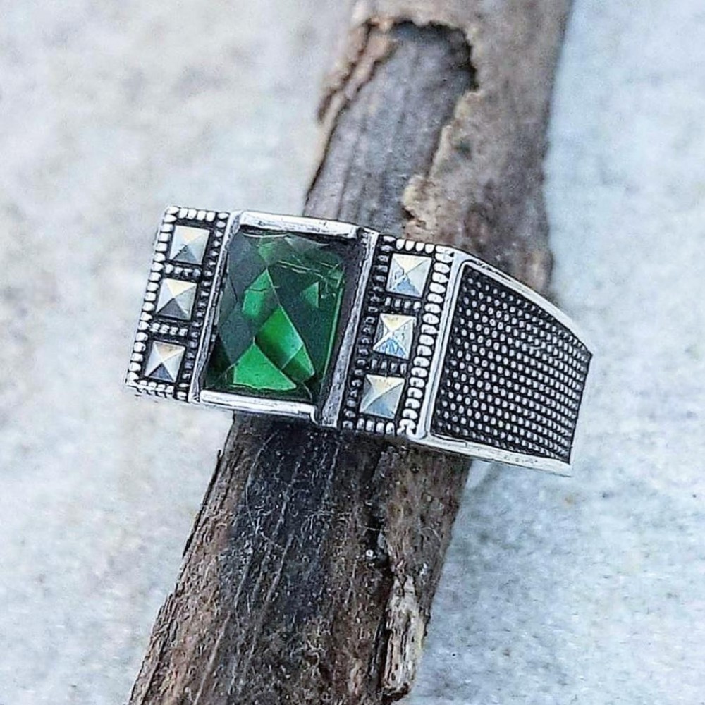 Joia estilosa e detalhada confeccionada em prata de lei envelhecida com uma pedra sintética de zirconia quadrada lapidação facetada e 6 marcassitas