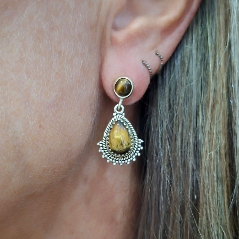 Joia linda e delicada confeccionada em prata de lei envelhecida, gemas lapidação cabochão e acabamento com pinos e tarraxas