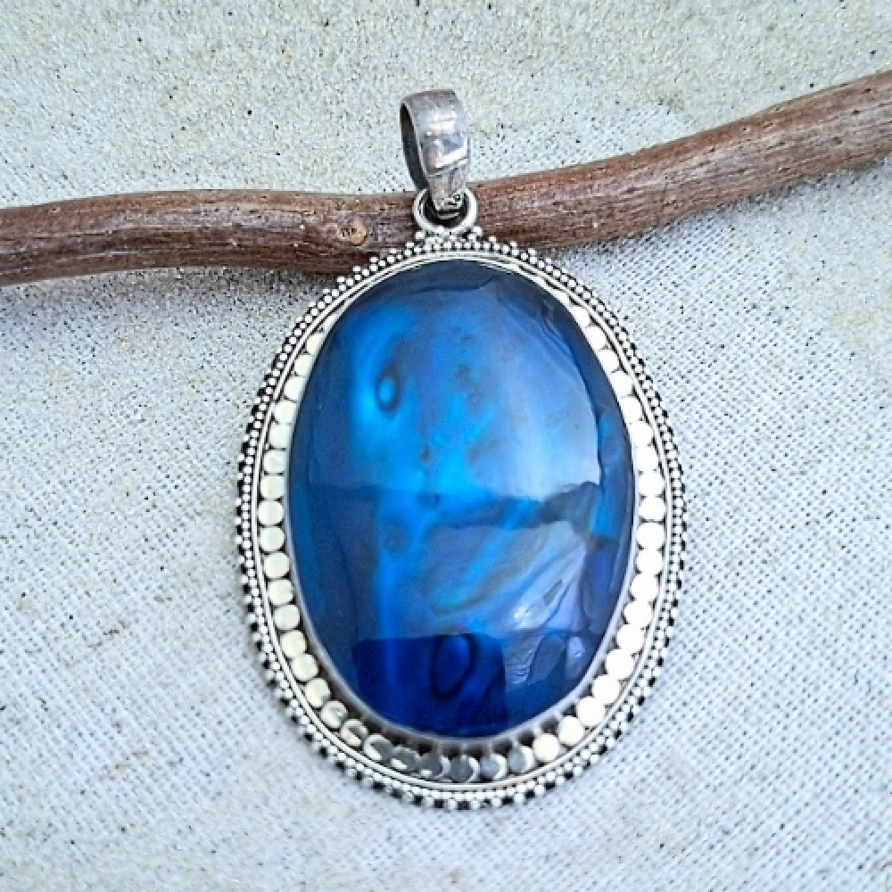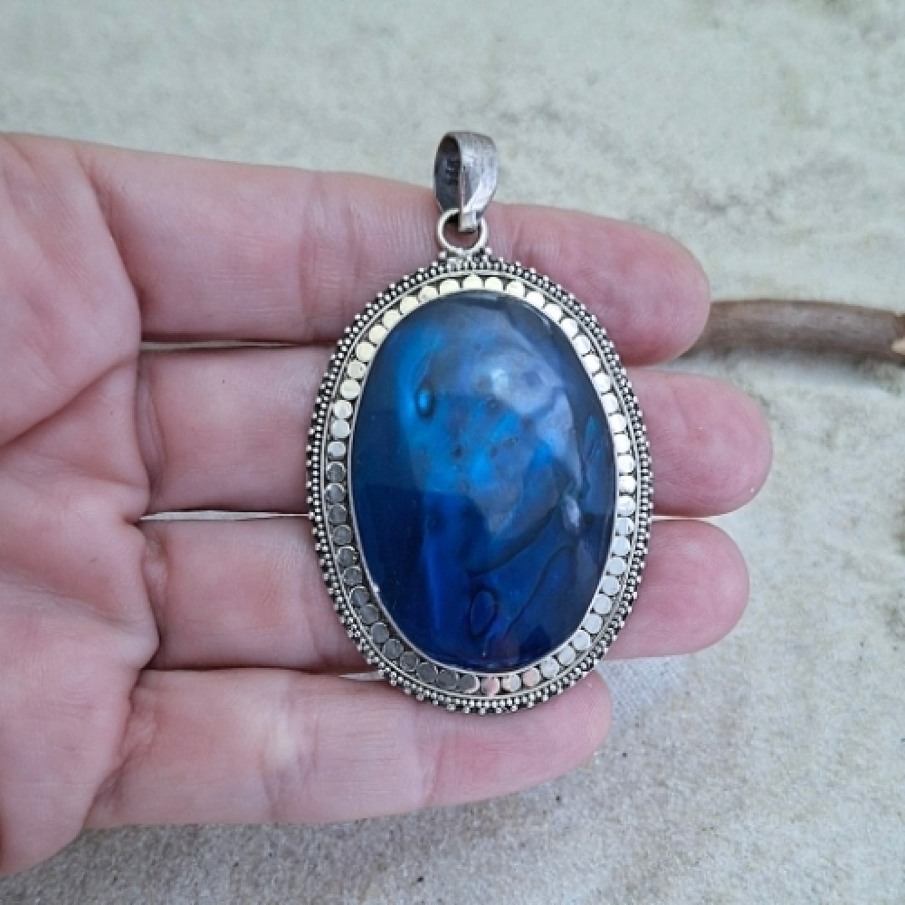 Joia com ornamentos artesanais incríveis confeccionada em prata de lei envelhecida e concha abalone com camada de resina para dar brilho e resistência a peça