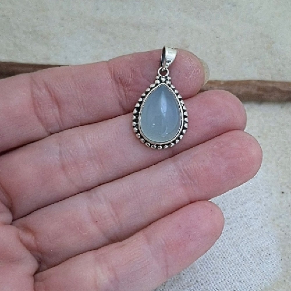 A calcedônia tem diversas tonalidades de verde e azul. Na antiguidade, os tibetanos comparavam a beleza da pedra à beleza da flor de lótus, que protegia da fraqueza,, insatisfação e melancolia. Traz felicidade. Alivia stress e brigas em família.