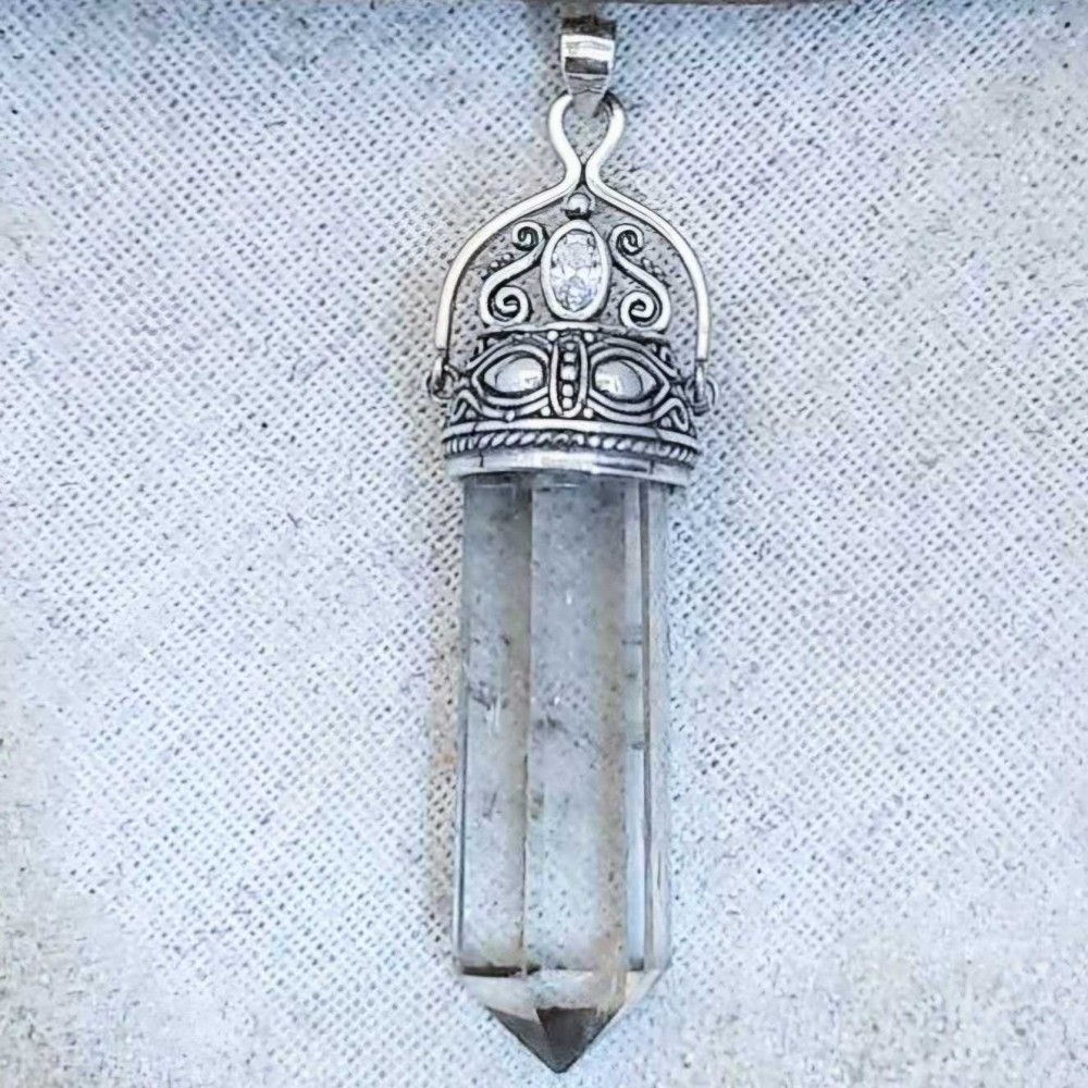 Joia linda e mística, confeccionada em prata de lei envelhecida, gema pêndulo e cristal oval lapidação facetada